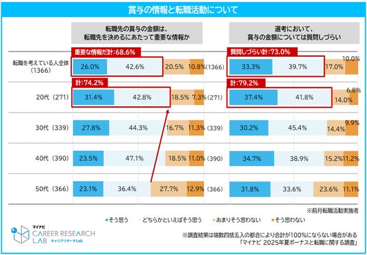 「転職先を選ぶ際に賞与金額を重要な情報」と捉えている人は68.6%にのぼり、特に20代でその傾向が強くみられた。