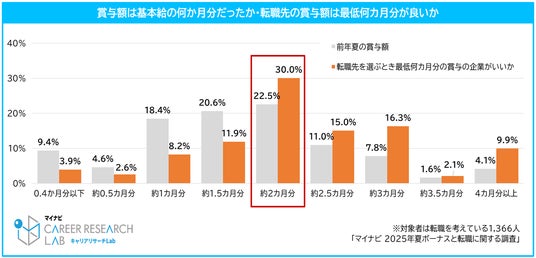 また、前年夏の賞与額が基本給の何カ月分だったか聞いたところ、最も多かったのは「約2カ月分(22.5%)」で、転職先に求める最低水準でも「約2カ月分(30.0%)」が最多であった。【図6】