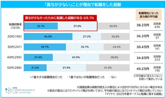 転職経験がある人のうち、過去に賞与が少ないことが理由で転職したと回答した人は69.1%(「1番大きな転職理由だった」(32.1%)+「1番ではないが転職理由だった」(37.0%)の合計)であった。