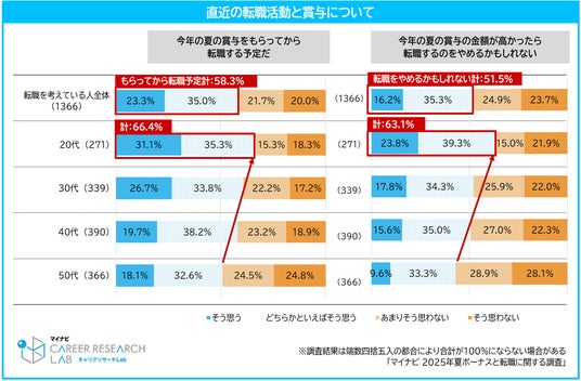 現在転職を考えている正社員の約6割が、賞与支給後に退職する予定だと回答している中、賞与額が高ければ転職を思いとどまる可能性があるという人も半数を超えました。特に20代では賞与が転職に与える影響が大きい傾向がみられています。