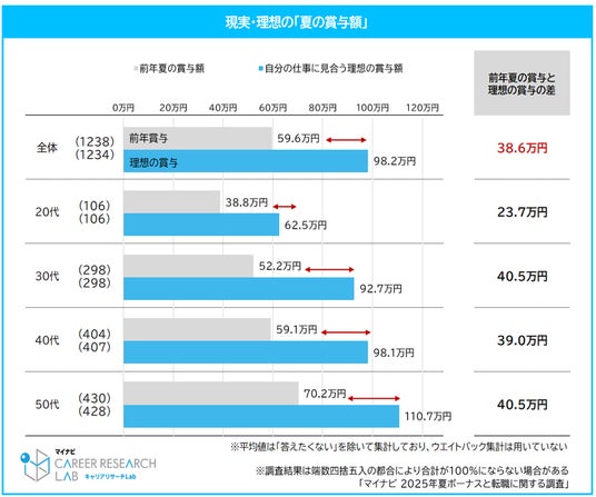 前年夏の賞与額は平均59.6万円で、自分の仕事に見合うと思う理想の賞与額は平均98.2万円となり、前年の賞与額と理想の賞与額のギャップは38.6万円だった。