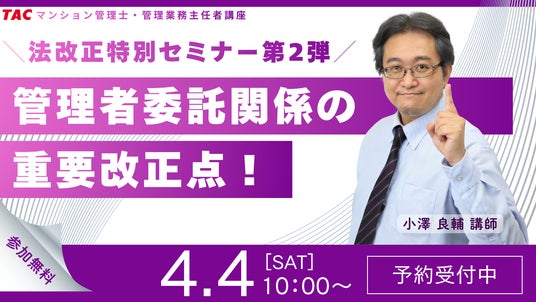 マンション管理士・管理業務主任者試験対策講座を展開しているTAC株式会社は、4/4(土)10:00より法改正がテーマのオンラインセミナーを開催します!TAC株式会社