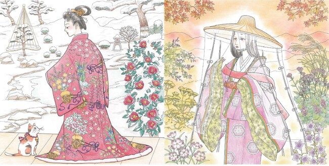 ページをめぐるたびに移り変わる季節ごとの衣装の文様、花々や草木、景色や風物、行事が楽しめ、