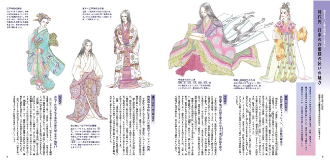 飛鳥時代は、領巾(ひれ)を肩からかけた唐風の姿、平安時代は華麗な十二単、室町時代は小袖、江戸時代は振袖と、それぞれの時代を象徴する装束は華やかで美しいものばかり。