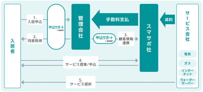 本提携により、入居者は『申込サポートbySUUMO』を介して物件申し込み時に当サービスのご案内に同意された場合、電気やガスなど自分に合ったライフライン手続きのサポートを無料で受けることができます。個人手配のお手続きとは異なり、書類の記入が不要でお電話だけで入居後サービスの手続きが完了するため、申込情報の入力など面倒な作業の必要がなくスムーズな新生活開始が可能となります。