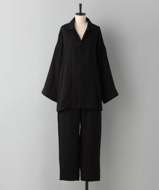 ダブルガーゼ素材で仕立てたシャツとパンツのセットアップ。