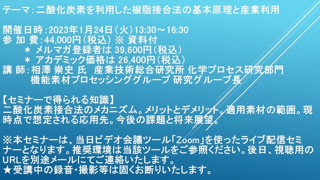 先端技術情報や市場情報を提供している(株)シーエムシー・リサーチ(千代田区神田錦町: https://cmcre.com/ )では、 各種材料・化学品などの市場動向・技術動向のセミナーや書籍発行を行っておりますが、 このたび「二酸化炭素を利用した樹脂接合法の基本原理と産業利用」と題するセミナーを、 講師に相澤 崇史 氏 産業技術総合研究所 化学プロセス研究部門 機能素材プロセッシンググループ 研究グループ長)をお迎えし、2023年1月24日(火)13:30より、 ZOOMを利用したライブ配信で開催いたします。 受講料は、 一般:44,000円(税込)、 弊社メルマガ会員:39,600円(税込)、 アカデミック価格は26,400円(税込)となっております(資料付)。