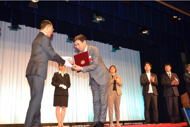 10月20日(金)に開催された第66 回「新聞広告の日」記念式典には、本広告においてマイクを握り、大きな口を開けて歌う男性のモデルをつとめた当社の代表取締役社長、水谷 靖本人が登壇し、表彰を受けました。