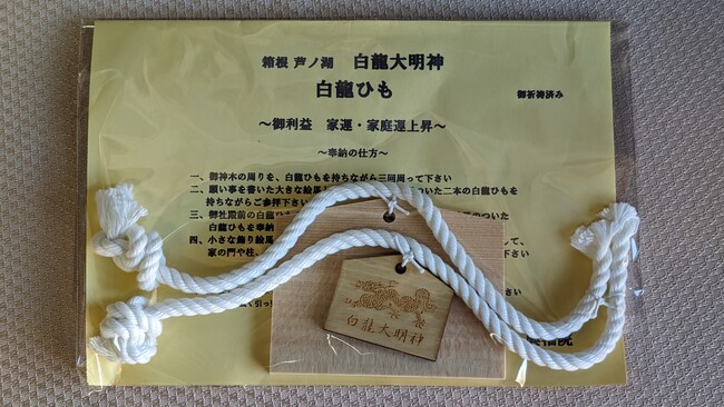 箱根九頭龍の森受付にて、家運・家庭運が上昇するといわれている「白龍大明神 白龍ひも」が販売されており、少し変わった奉納の仕方が話題です。奉納の仕方は下記HPよりご覧ください。