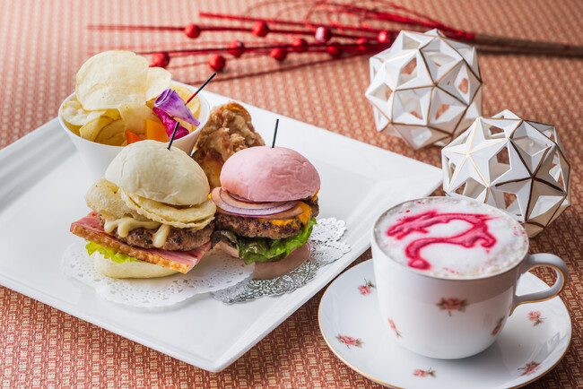 九頭龍神社にちなんだ赤いバンズのバーガーにはレッドチェダーチーズとレッドオニオン、味と食感のアクセントにビーフジャーキーが練りこまれたパティを、白龍神社にちなんだ白いバンズのバーガーにはホワイトチーズソースとオニオンフライ、ガーリックを効かせたパティを挟みました。
