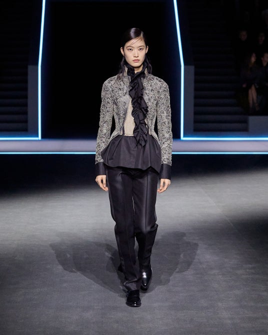 マリア・グラツィア・キウリが発表した2025-2026年秋冬コレクションには、歴史的な刺繍技術とモダニティが融合したルックが登場しました。古代より伝わるコード刺繍やニードルポイントレースの技術を用い、ルレックス、アンティークシルバー、パールが新たな輝きを放ちます。菱形の幾何学模様や繊細で立体的な葉がパールと共に配置された刺繍がドレスの中でも大きな面積を占めます。ドレスのスカートには14メートルもの刺繍が施され、軽やかでありながら、格式ある印象を与えるものとなりました。