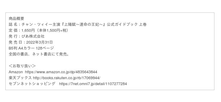 2月24日より、各ネット書店にて予約スタートしました。この春大注目の中国時代劇ドラマ『上陽賦~運命の王妃~』をたっぷりと楽しみたい方に必見です。ぜひ本書を片手に、ドラマの世界に浸ってみませんか?