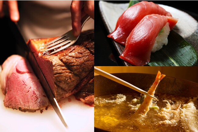 『あまおうスイーツ&デリシャスビュッフェ』は豊富なグルメも魅力のひとつ。ホテルニューオータニが誇る“伝統の美食”が所せましと並びます。『USプライムのローストビーフ スパイシーソース』は、味わい、ジューシーさ、柔らかさのすべてにおいて高い品質が認められた「USプライムビーフ」をホテル伝統の製法で仕上げた極上メニュー。また、ネタの旨味を引き立てる「赤酢シャリ」を使用した『江戸前寿司』、海老、鯛、蛸などの新鮮なネタを職人が揚げて提供する『天麩羅』、王道中国料理メニューの『海老のチリソース煮』や『黒毛和牛の麻婆豆腐』など、 和・洋・中こだわりのメニューをご堪能いただけます。