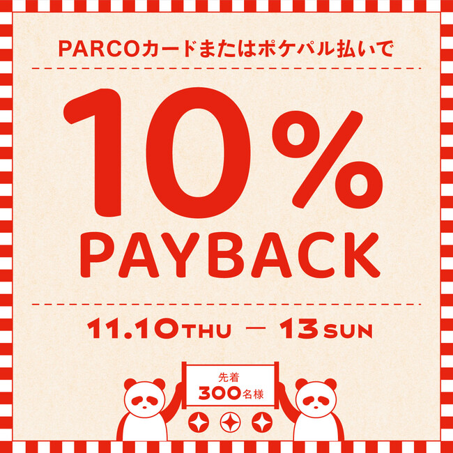 期間中、PARCOカード またはポケパル払いご利用で10,000円(税込)ごとに1,000円分のパルコヤお買物券をプレゼントする10%PAYBACKキャンペーンを開催いたします。今すぐほしい秋冬ファッションや旬のグルメに、ぜひご利用ください。