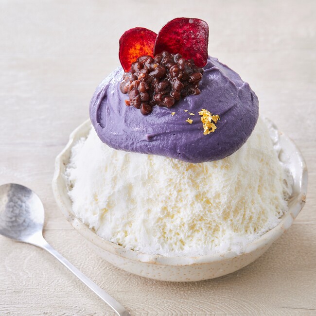 沖縄県石垣島産の甘みを増した紫芋を丁寧に裏ごしして、仕立てた濃厚なお芋クリームのかき氷。自家製練乳ミルクが染みた氷の中には黒ごまクリームとほんのり香る紫芋チーズクリームが隠れてます。