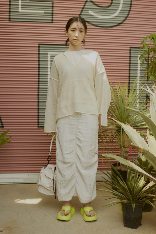 メッシュ素材のフーディーとシャーリングの効いたナイロンスカートでアクティブなムードに。全身ホワイトでまとめ、洗練された印象に仕上げました。イエローのサンダルなど小物で目を引く色を投入すると、洒落感がアップします。