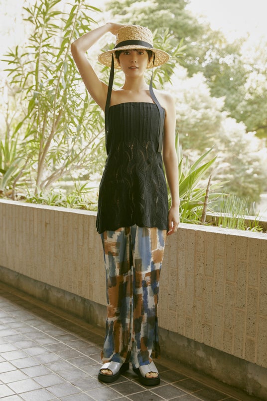 ヘルシーな肌見せを叶えるビスチェと、オリエンタル柄のパンツでリゾート感漂う着こなしに。足元はシルバーで締めて、モダンな要素をプラス。仕上げにリボン付きのラフィアハットをかぶり、夏の日差しを味方に。