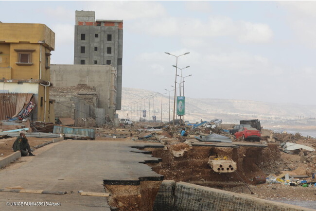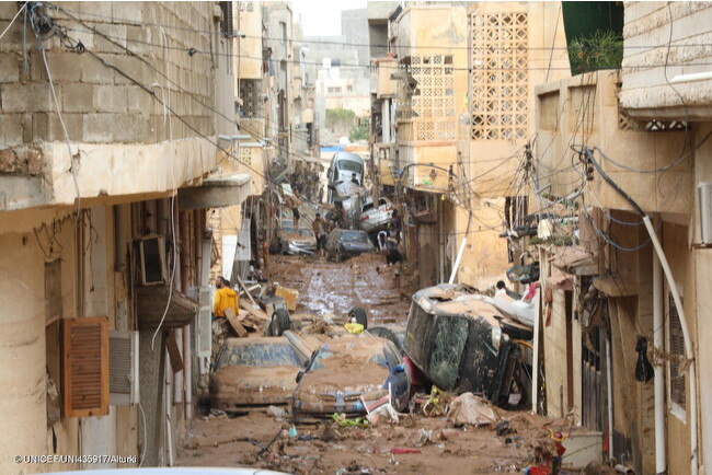 洪水被災地を訪れたユニセフ(国連児童基金)リビア事務所代表のミケーレ・セルヴァデーイは以下のように述べています。「リビアの子どもたちは、10年以上にわたる紛争の後に、再び悲劇に直面しています。私たちの優先課題は、命を守るための支援を拡大することであり、とりわけ保健物資、水・衛生物資、心理社会的支援の提供および家族の捜索、さらには水を媒介とする感染症の予防にあたります。破滅的状況を防ぐには、一刻の猶予も許されません。世界中の過去の災害から私たちが学んだのは、洪水の余波の方が、異常気象の発生そのものよりも子どもたちに致命的な影響を及ぼすということです。子どもたちは最も脆弱な立場に置かれており、病気の集団感染、安全な飲料水の欠如、栄養不良、学習の中断、暴力などの高いリスクにさらされているのです」