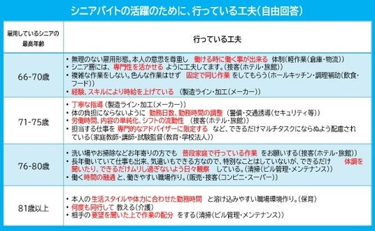 シニアバイトが活躍するための工夫を自由回答で見ると、「体の負担にならないように、勤務日数、勤務時間の調整」や「できるだけ体調を聞くなど、無理をしないように見ている」「相手の要望を聞いたうえで、業務を分配している」といった回答がみられ、企業側が勤務形態に柔軟性を持たせることや、業務内容の負担を軽減する工夫を行うなど、これまでの経験やスキルを発揮しつつ無理なく働き続けられる環境づくりを進めていることがうかがえた。【図3、4】