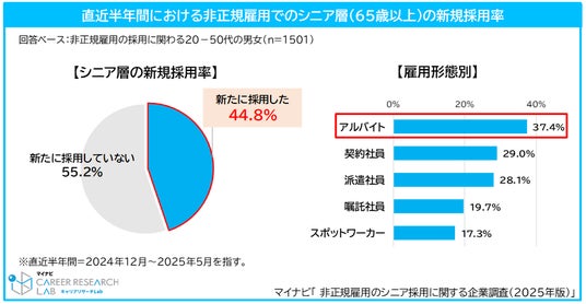 直近半年間に非正規雇用でシニア(65歳以上)を新たに採用した企業は44.8%だった。また、雇用形態別では「アルバイト」が37.4%で最も高く、「契約社員」が29.0%、「派遣社員」が28.1%となった。