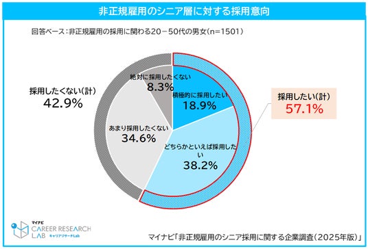 こうした中、今回の調査では、企業の57.1%が非正規雇用のシニア(65歳以上)を「採用したい」と回答しており、企業側の採用意欲も高いことが分かりました。