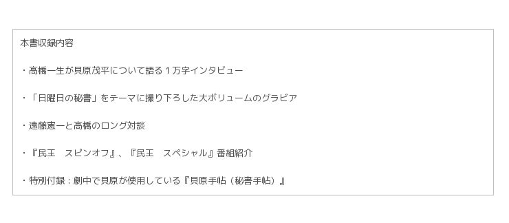 2015年7月~9月にテレビ朝日系列で放送された大ヒット連続ドラマ『民王』の付録つきブックが登場です! 4月15日(金)・22日(金)に『民王スペシャル』および『民王スピンオフ』が2週にわたって放送されるのを受け、『民王スピンオフ』主演の貝原(高橋一生)をフィーチャーした一冊となっています。