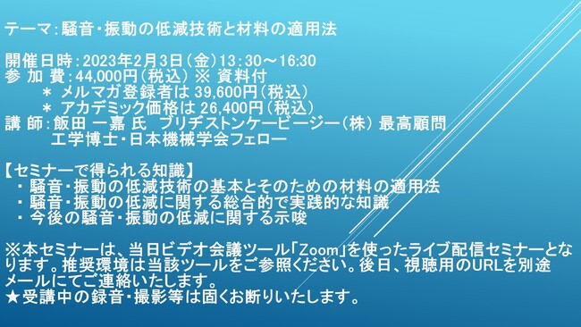 先端技術情報や市場情報を提供している(株)シーエムシー・リサーチ(千代田区神田錦町: https://cmcre.com/ )では、 各種材料・化学品などの市場動向・技術動向のセミナーや書籍発行を行っておりますが、 このたび「騒音・振動の低減技術と材料の適用法」と題するセミナーを、 講師に飯田 一嘉 氏 ブリヂストンケービージー(株) 最高顧問 工学博士・日本機械学会フェロー)をお迎えし、2022年2月3日(金)13:30より、 ZOOMを利用したライブ配信で開催いたします。 受講料は、 一般:44,000円(税込)、 弊社メルマガ会員:39,600円(税込)、 アカデミック価格は26,400円(税込)となっております(資料付)。