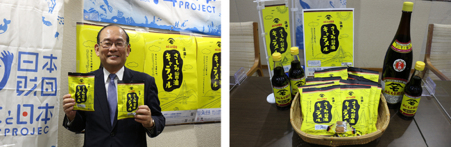 お披露目式に出席した浜田市の久保田章市市長は試食すると「おいしい!個人的にも40年以上家族でふじもと醤油を愛用しています。浜田市の新お土産になるようPRしていきたい」と関係者らにエールを送りました。また、ふじもと醤油の藤本太郎代表取締役社長は「まさか、さしみ醤油がキャラメルになるとは思っても見なかった。美味しい味に仕上がったので、是非多くの人に食べてほしい」と”さしみ醤油”がお菓子になったことに驚いていることを話しました。