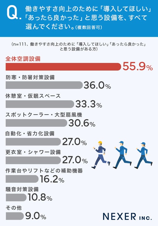 もっとも多かった回答は「全体空調設備」で55.9%でした。次いで「防寒・防暑対策設備」が36.0%、「休憩室・仮眠スペース」が33.3%、「スポットクーラー・大型扇風機」が30.6%と続いています。