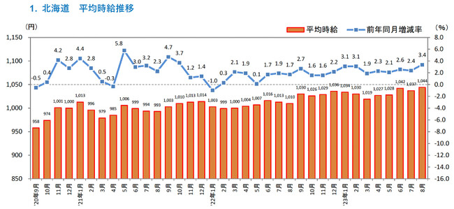 ■北海道の平均時給は1,044円(前年同月1,010円、前月1,037円)