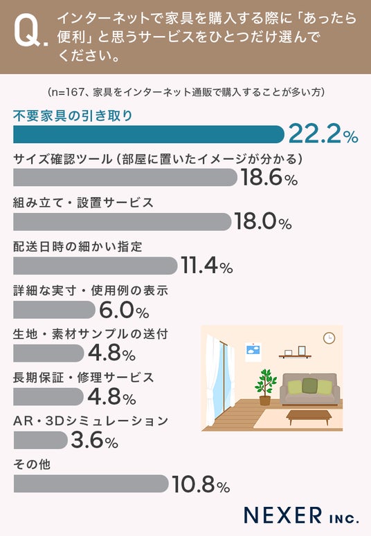 1位は「不要家具の引き取り」で22.2%、2位は「サイズ確認ツール(部屋に置いたイメージが分かる)」で18.6%、3位は「組み立て・設置サービス」で18.0%という結果になりました。