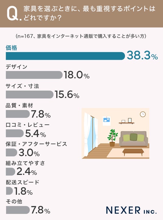 続いて、インターネット通販で家具を購入すると回答した方を対象に、家具を選ぶ際に最も重視するポイントについて調査しました。