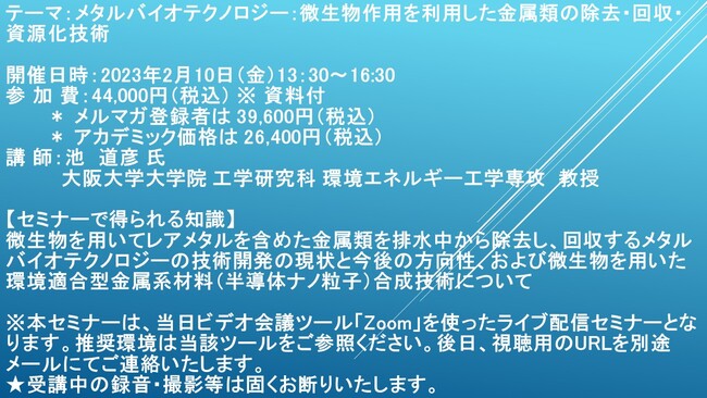 先端技術情報や市場情報を提供している(株)シーエムシー・リサーチ(千代田区神田錦町: https://cmcre.com/ )では、 各種材料・化学品などの市場動向・技術動向のセミナーや書籍発行を行っておりますが、 このたび「メタルバイオテクノロジー:微生物作用を利用した金属類の除去・回収・資源化技術」と題するセミナーを、 講師に池 道彦 氏 大阪大学大学院 工学研究科 環境エネルギー工学専攻 教授)をお迎えし、2023年2月10日(金)13:30より、 ZOOMを利用したライブ配信で開催いたします。 受講料は、 一般:44,000円(税込)、 弊社メルマガ会員:39,600円(税込)、 アカデミック価格は26,400円(税込)となっております(資料付)。