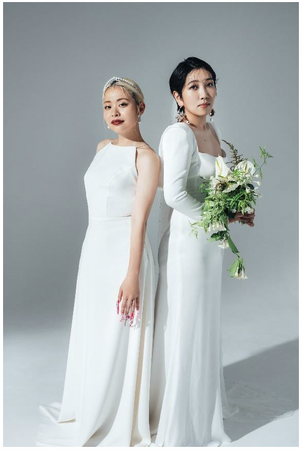 今回の撮影で大人キュートな花嫁姿に大変身を果たした荒川さんは「普段、自分の顔を出したくないので髪の毛を上げるのも苦手で、カラコンを着けないとあまり人にも会いたくないくらい。だから初めは恥ずかしくって。でもやったことがないことをいっぱいやらせてもらって、きれいにしていただいて、明日から自分が変われそうって思いました」。初めての本格的なウエディングドレスについては、「何かすごかったです。すっごいパワーがあった。気分が変わるし、強さをもらえたなって思いました」と語ってくれました。また、相方・はるさんのクールなドレス姿については、「見る前はリアクションも大きめにしなくちゃって考えてちょっと不安だったんですけど、実際見たら『おおおお~!!』って自然に声が出ました。かっこいい!」と教えてくれました。