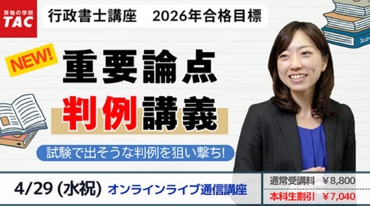 行政書士試験対策講座を展開しているTAC株式会社(東京都千代田区)は、2026年合格目標で学習中の方を対象に、今年度の行政書士試験で狙われそうな判例をピックアップして解説する『重要論点判例講義』(全2回)を4/29(水祝)にオンラインライブで新規開講します。