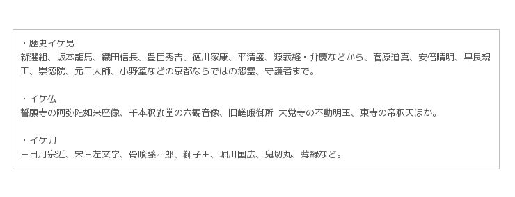 京都の歴史を彩る 歴史イケ男(だん)、イケ仏(ぶつ)、イケ刀(とう)の「ゆかりの地」を網羅した、ほかにない御朱印巡り決定版です。114箇所、御朱印63枚を収録。