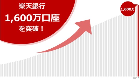 楽天銀行株式会社(以下「楽天銀行」)は、2024年7月29日(月)に預金口座数が1,600万口座(注1)を突破しました。