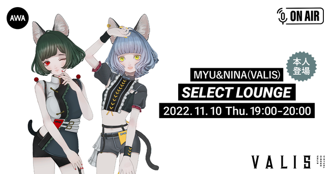 AWA株式会社(本社:東京都港区、代表取締役CEO:冨樫晃己)が運営する、サブスクリプション型(定額制)音楽ストリーミングサービス「AWA(アワ)」は、2022年11月10日(木) 19:00~20:00の1時間に渡り、無料で誰でも参加できるオンライン空間「LOUNGE(ラウンジ)」で、神出鬼没のバーチャルサーカス団としてパフォーマンスを行う、6人組のバーチャルガールズグループ・VALIS(ヴァリス)のMYUとNINAが音声とチャットで参加するラジオ配信ラウンジを開催いたします。