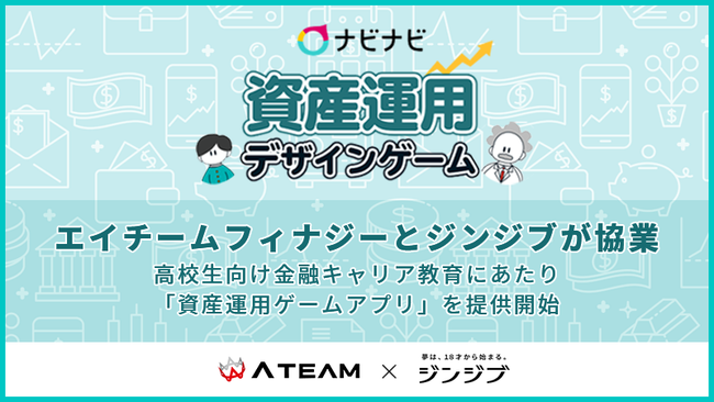 株式会社エイチームのグループ会社で、「世の中からお金の不安を解消し、より人生が豊かになる社会を実現する」をミッションに掲げる株式会社エイチームフィナジー(本社:大阪府大阪市、代表取締役社長:間瀬文雄、以下当社)は、高校生の就職活動やキャリア教育支援と企業の高卒採用育成支援を行う株式会社ジンジブ(本社:大阪府大阪市、代表取締役:佐々木 満秀、以下「ジンジブ」)と、当社が開発したWebアプリ「ナビナビ資産運用デザインゲーム」を使用した高校生向け金融キャリア教育において協業を開始いたします。