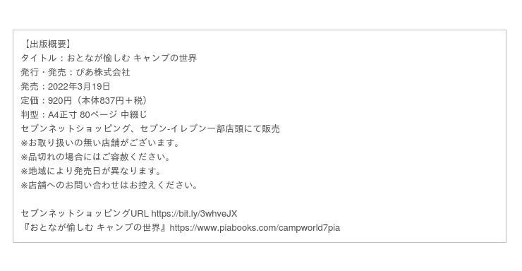 本日3月19日、ぴあ株式会社より、セブンネットショッピングおよびセブン-イレブン一部店頭限定ムック本『おとなが愉しむ キャンプの世界』が発売となりました。