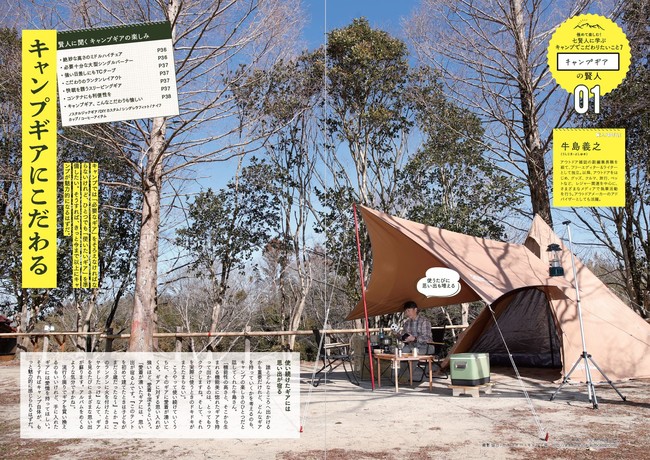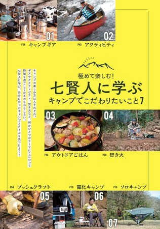 「賢人がこだわるキャンプギアたち」「春夏秋冬アクティビティ」「ダッチオーブンはここまで奥深い」「薪や組み方にこだわってみる」「ブッシュクラフトとは自然と向き合える時間」「電気ギア活用テクニック」「ソロキャンお手軽レシピ」など、各賢人たちのこだわりとその極意やコツは、これからさらにキャンプを極めたい人たち必読です。