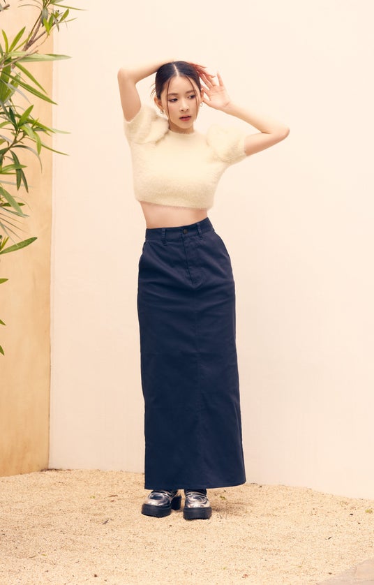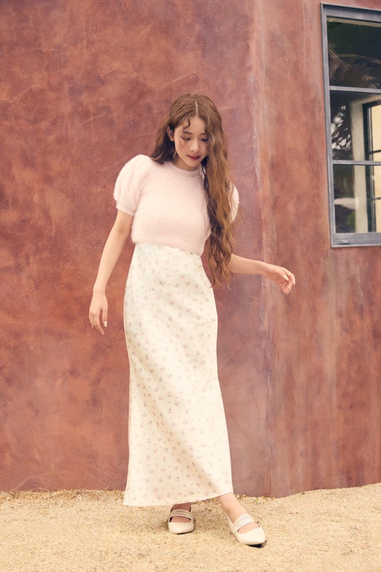 わたしの大好きな、フワフワと柔らかいシャギー素材。パフスリーブがポイントで、短丈だから甘すぎない印象に。この1枚で着こなしが成立しますが、レイヤードにも活躍するので、持っておくとコーディネートの幅が広がります。