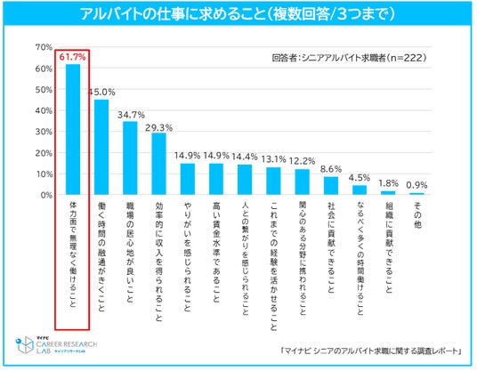 直近2カ月間にアルバイトの求職活動をしたシニアに、アルバイトの仕事に求めることを聞いたところ、「体力面で無理なく働けること」が61.7%となり、他の項目に比べて高かった。