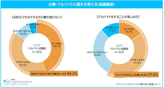 また、直近2カ月間(2025年5-6月)にアルバイトの求職活動をしたシニアに、仕事・アルバイトに関する考え方を聞いたところ、就業意欲では、「元気なうちはできるだけ働き続けたい」とした割合は84.2%(あてはまる+ややあてはまる)にのぼり、「アルバイトをすることが楽しみ」は57.2%と半数以上となった。