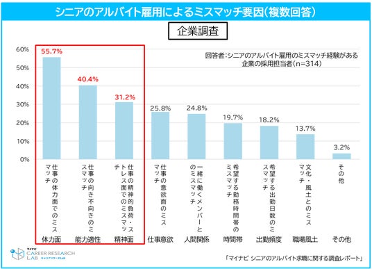 シニアのアルバイト雇用によるミスマッチの要因は、「体力面(仕事の体力面でのミスマッチ)」が55.7%で最多となり、次いで「能力適性(仕事の向き不向きのミスマッチ)」が40.4%、「精神面(仕事の精神的負荷・ストレス面でのミスマッチ)」が31.2%で続いた。