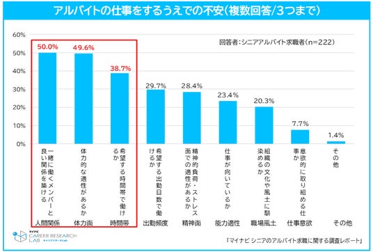 アルバイトの仕事をするうえでの不安を聞いたところ、「人間関係(一緒に働くメンバーと良い関係を築けるか)」が50.0%で最も多く、次いで「体力面(体力的な適性があるか)」が49.6%、「時間帯(希望する時間帯で働けるか)」が38.7%と続いた。