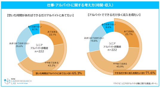 また、時間や収入については、「空いた時間があればできるだけアルバイトにあてたい」は65.3%、「アルバイトでできるだけ多く収入を得たい」が71.6%となり、就業意欲にあふれ生き生きと働こうとするシニアの様子がうかがえる。【図1、2、3】