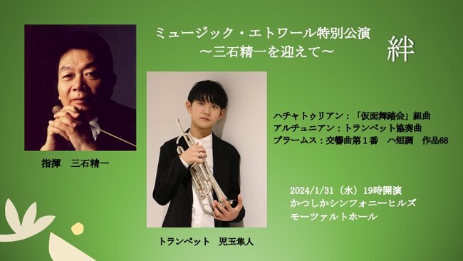 ミュージック・エトワール主催、ミュージック・エトワール特別公演「絆」が2024年1月31日 (水)にかつしかシンフォニーヒルズ モーツァルトホール(東京都葛飾区立石六丁目33番1号)にて開催されます。