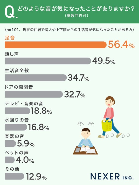 最も多かったのは「足音」で56.4%、次いで「話し声」が49.5%、そして「生活音全般」が34.7%という結果でした。「ドアの開閉音」も32.7%で、日常のちょっとした動作音が気になる方も多いようです。