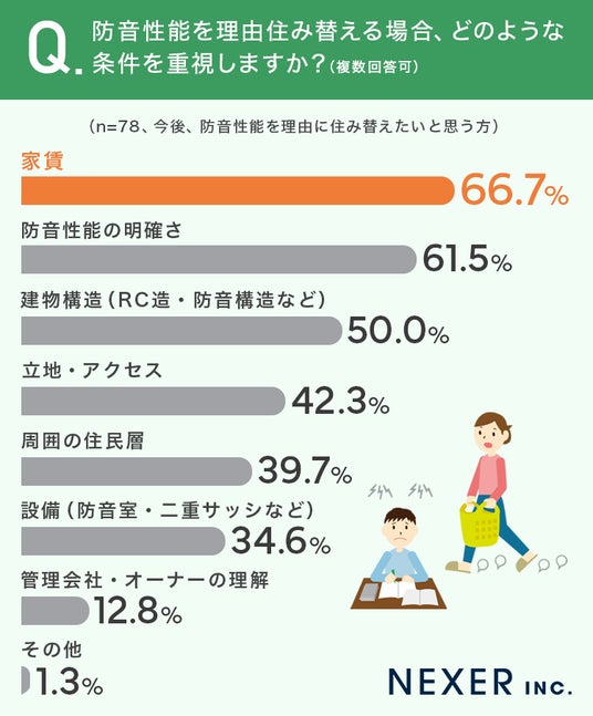 最も多かったのは「家賃」で66.7%、次いで「防音性能の明確さ」が61.5%、そして「建物構造(RC造・防音構造など)」が50.0%でした。